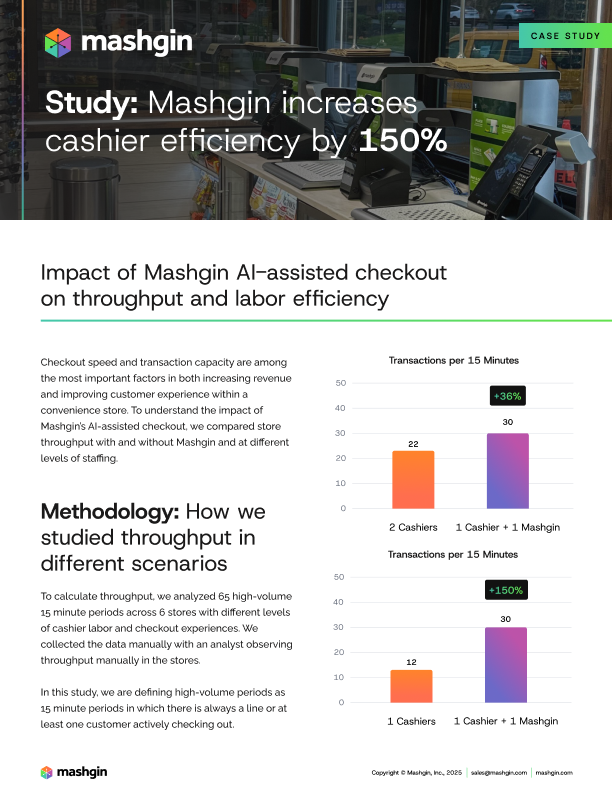 Learn how AI-assisted checkout significantly increases throughput, more than doubling cashier efficiency. To understand the impact of Mashgin, we analyzed 65 high-volume 15-minute periods across 6 stores to compare throughput with and without Mashgin at different levels of staffing.